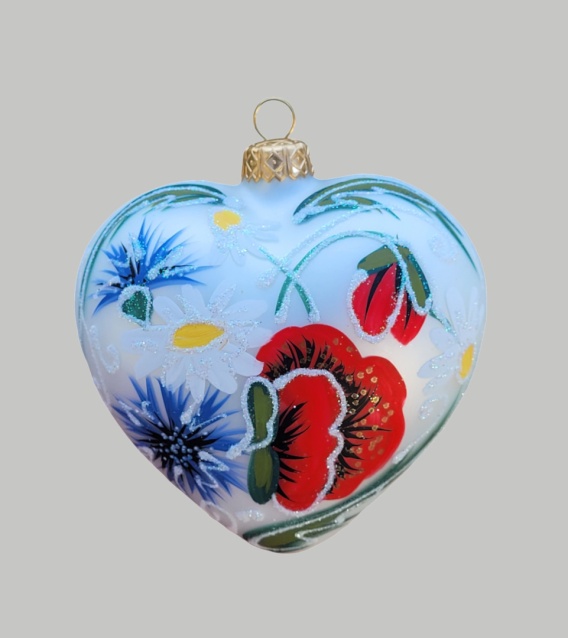Bombka wykonana jest ze szkła, ręcznie malowana i zdobiona
